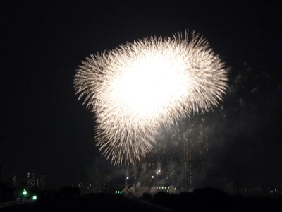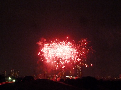 まず荒川を目指し河川敷沿いに上流に向かい、打ち上げ場所の約1.4km手前(自宅から約10km)で交通規制(通行止め)になっていたので、ここ(土手の上)で花火見学をして、また走って帰りました。